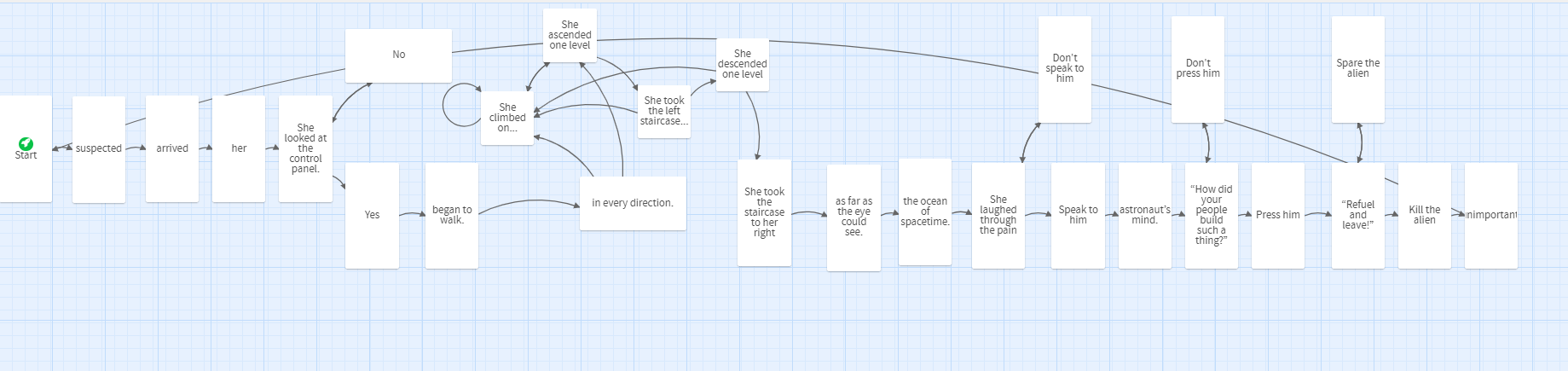 Dialogue was tracked in spreadsheet format, linked to the speaker and the choice branch. The below excerpt is from the moment the Astronaut meets the Alien technician.