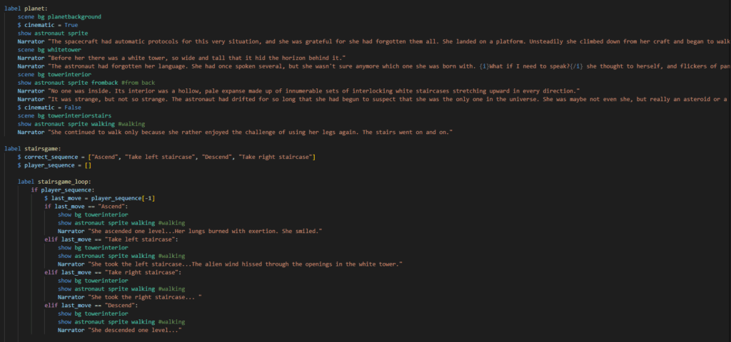 Below, this block of Ren’Py code demonstrates my approach to the “climbing stairs” mini-game within the story. The code does not let the player progress unless the climb the stairs of the White Tower in the correct order.