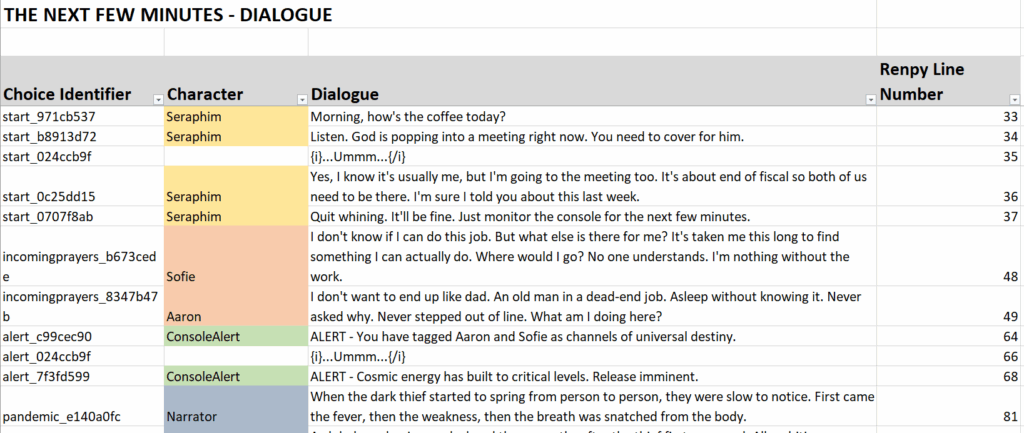 The story is divided into two major plots, with a total of six unique endings. Once the player has chosen the initial plot, that plot may branch in several different directions. Every ending leads to an epilogue that allows the player to play through again. Dialogue was tracked in spreadsheet format, linked to the speaker and the choice branch. The below excerpt is from the Prologue chapter.